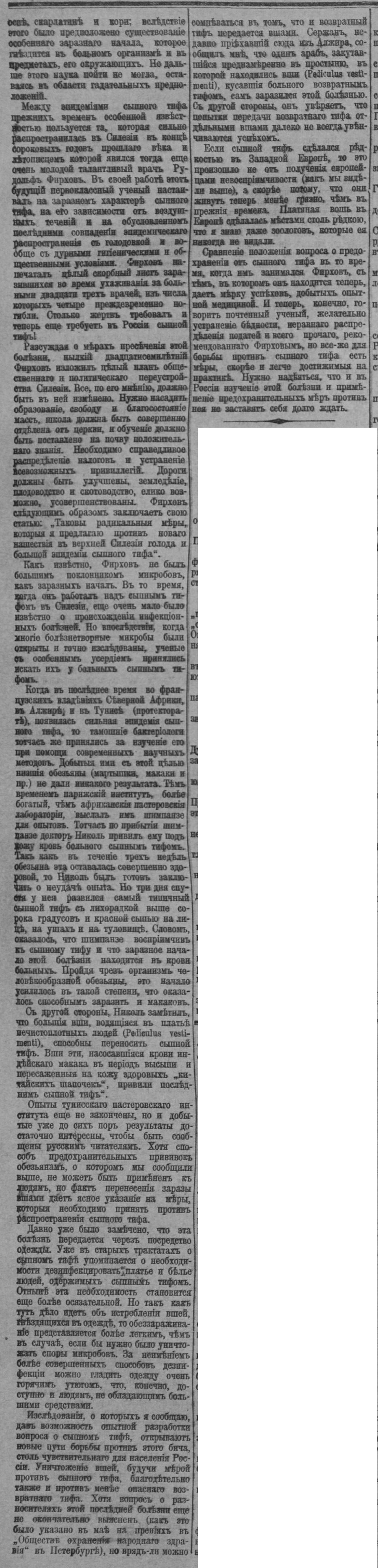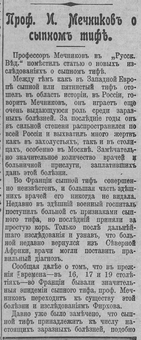 Профессор И.Мечников о сыпном тифе // Утро : политическая, общественная, литературная и экономическая газета. 1909, 8 августа (№ 812). – Харьков, 1909. – С. 3-4.