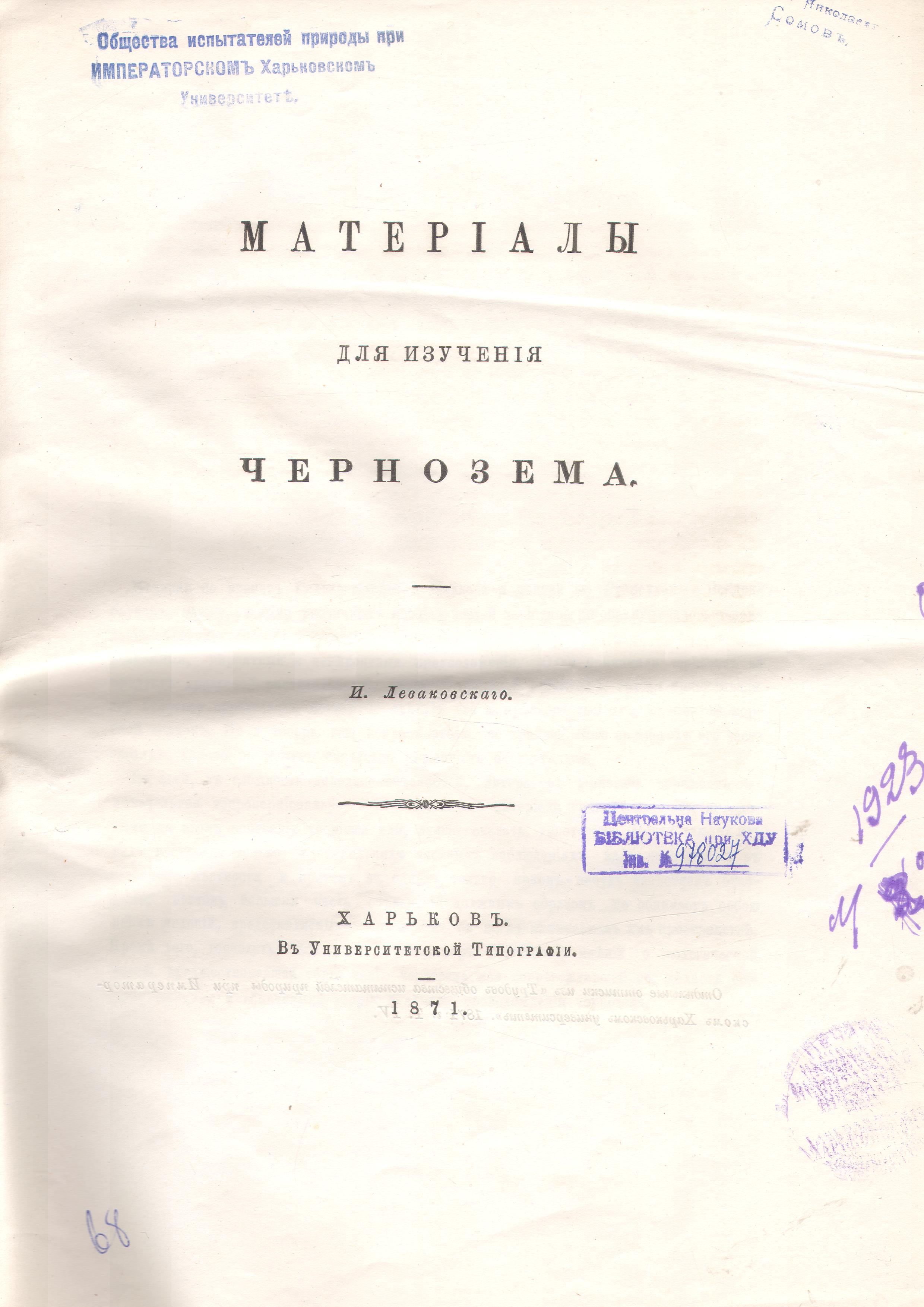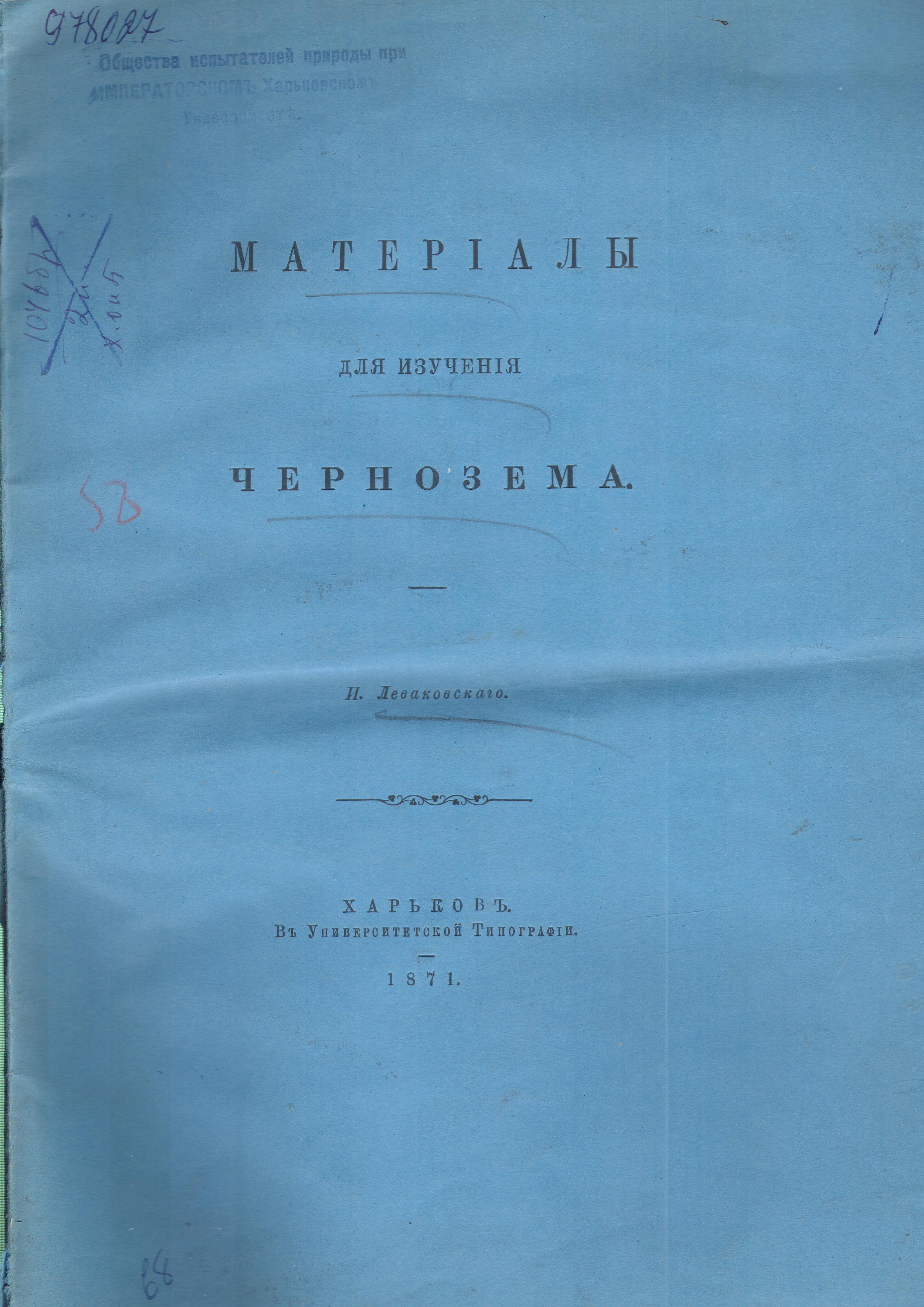 Леваковский, Иван Федорович. Материалы для изучения чернозема / И. Леваковский . – Харьков : В Университетской типографии , 1871 . – 52 с.